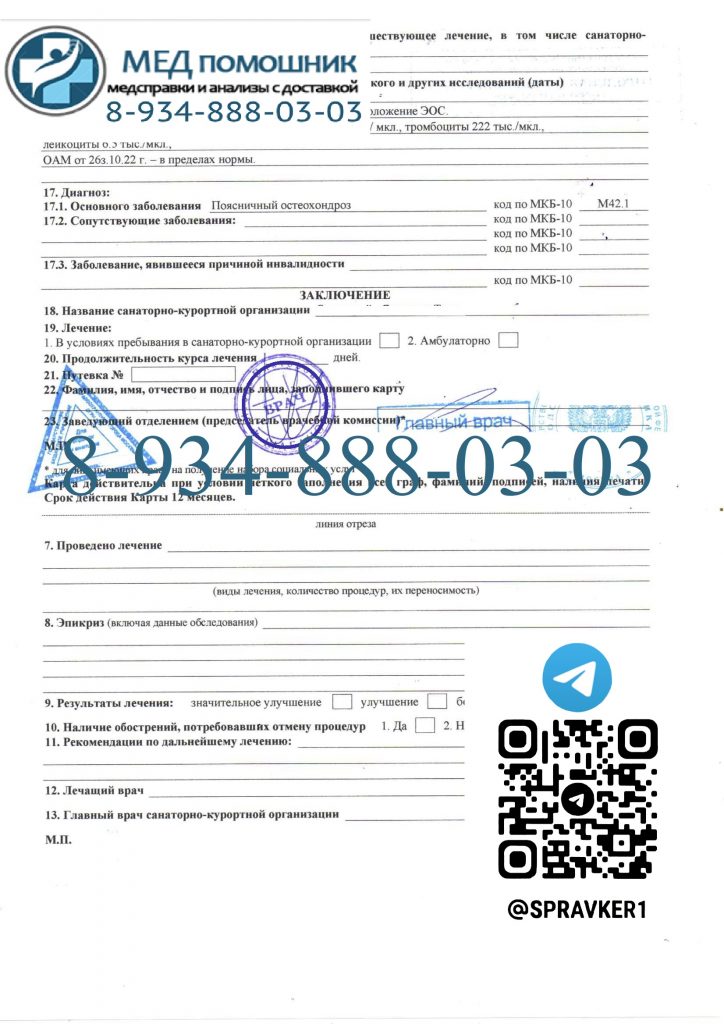 Курортная карта для санатория купить в Королеве с доставкой, это выбор занятого человека. Который не может найти время или же желания ехать по всем этим врачебным обследованиям ради формальной бумажки. Ведь вы знайте о своем здоровье, получили путевку. И просто хотите поехать отдохнуть, а не лечится. Но даже в таком случаи все равно нужно будет посетить врача – Терапевта, Невролога. Пройти флюорографию, получить расшифровку ЭКГ. А также врача – Гинеколога для женщин. Чтобы по приезду в санаторий у вас на руках была карта 072 с информацией о вашем здоровье. А также справку об ЭПИДОКРУЖЕНИИ, что вы не контактировали за последние дни с инфекционными больными людьми. При необходимости у нас также можно будет купить справки из НАРКО и ПСИХ диспансеров для любого случая в жизни.